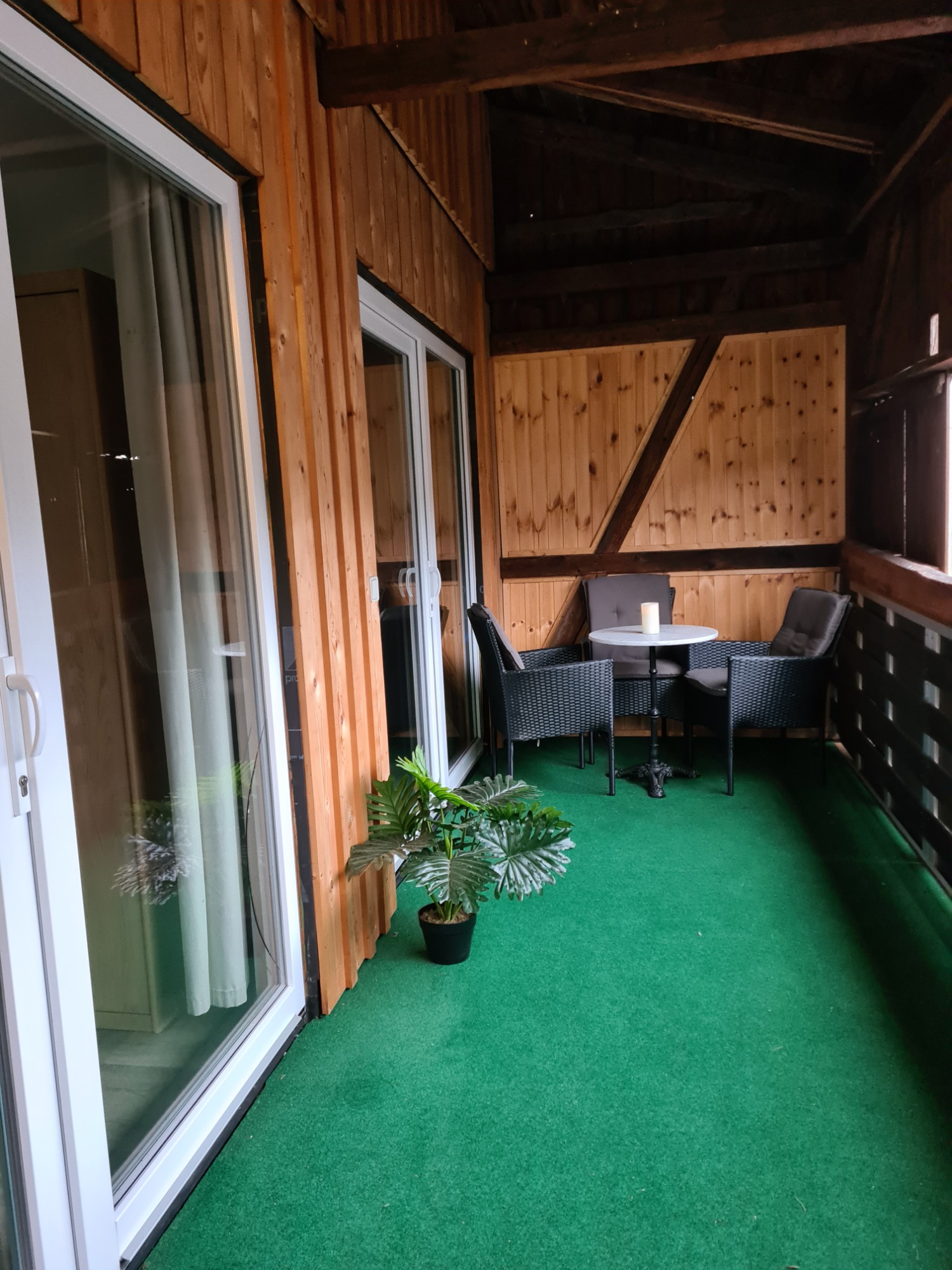 Das absolute Highlight der Wohnung ist der überdachte, holzverkleidete Balkon mit Sitzgelegenheiten. Durch die große Glasfront ist er harmonisch mit dem Wohnbereich verbunden und lässt viel Licht in die Wohnung. Ob Frühstück im Morgenlicht, ein gutes Buch am Nachmittag oder ein Glas Wein am Abend – hier entsteht schnell ein Lieblingsplatz, der zu jeder Tageszeit zum Verweilen einlädt.